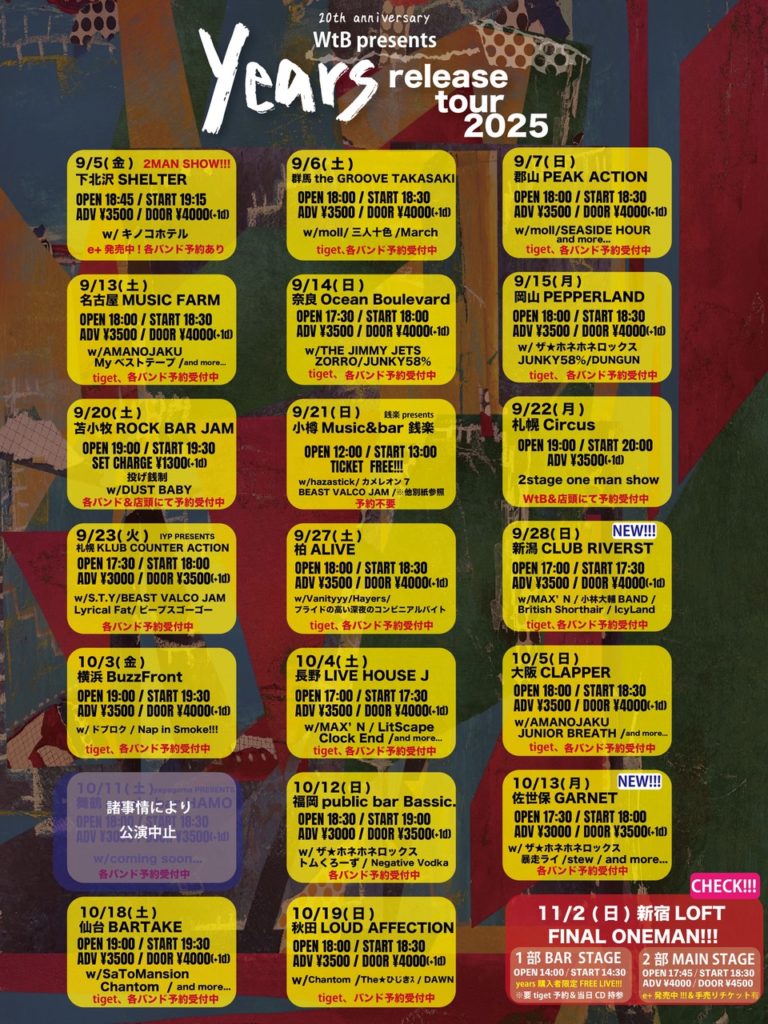 [2025.08.06] years release tourの舞鶴公演についてのお知らせ Posted on 08/07/202508/07/2025| By BylineWtB 10月11日(土)舞鶴HAMOのライブ公演は諸事情により中止となりました。 楽しみにしてくださった皆様 本当にごめんなさい。 今ツアーでは舞鶴公演は一旦中止となりますが、別の機会にリベンジしたいと思っておりますので、よろしくお願いいたします。
